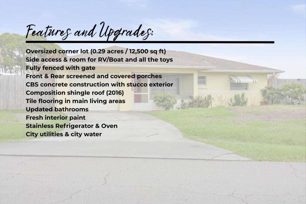 Welcome to this charming Port St. Lucie retreat! Offering rare outdoor space and privacy that far exceeds the neighborhood standard with a fully fenced in corner .29-acre lot and inviting covered front porch or retreat to the spacious covered back porch, perfect for shaded afternoon gatherings or morning coffee. Peace of mind comes built-in with a 2016 roof and CBS construction, while the home's design perfectly captures the Florida lifestyle. This well-maintained 2-bedroom, 2-bathroom home feat...Welcome to this charming Port St. Lucie retreat! Offering rare outdoor space and privacy that far exceeds the neighborhood standard with a fully fenced in corner .29-acre lot and inviting covered front porch or retreat to the spacious covered back porch, perfect for shaded afternoon gatherings or morning coffee. Peace of mind comes built-in with a 2016 roof and CBS construction, while the home's design perfectly captures the Florida lifestyle. This well-maintained 2-bedroom, 2-bathroom home features a functional layout, updated bathrooms, fresh paint throughout, and tile floors in main areas. Just minutes from boat ramps and Crosstown Parkway, it's the perfect blend of comfort and convenience. Whether you need room for a pool, garden, or boat storage, this oversized lot delivers.